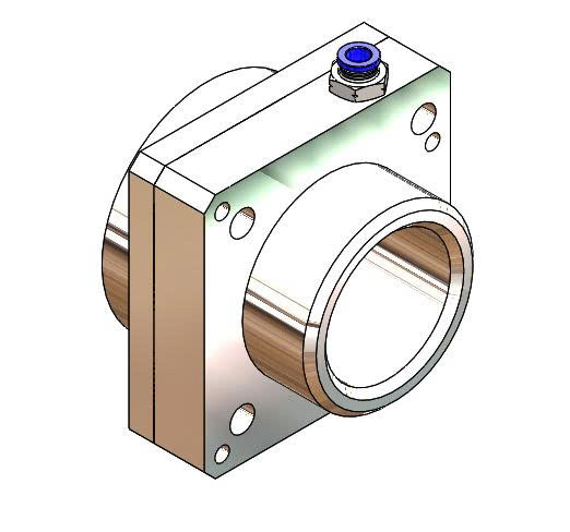 Đặc điểm nổi bật là sự kết hợp giữa cấu trúc cơ khí vững chắc (lỗ lắp ráp) và một đầu nối khí nén (Push-to-Connect Fitting) màu xanh/đen nằm ở mặt trên, cho thấy nó có khả năng tương tác hoặc được điều khiển bằng khí nén.